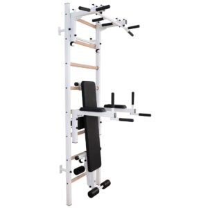 Drabinka gimnastyczna drewniano metalowa z drążkiem, ławką i akcesoriami benchk 233w