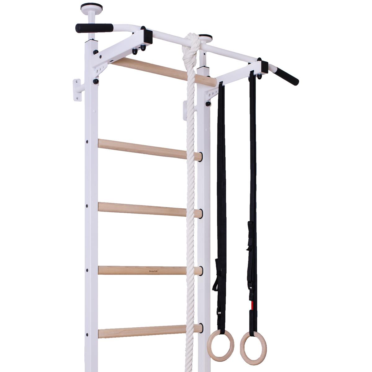 W skład zestawu oprócz drabinki wchodzi drążek do podciągania, kółka gimnastyczne oraz lina z huśtawką. Drabinka montowana jest do ściany lub rozporowo (podłoga-sufit).