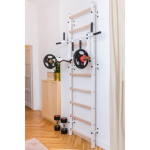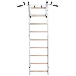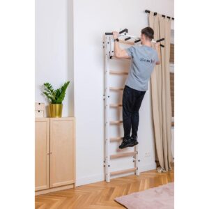 Drabinka gimnastyczna z regulowanym drążkiem to model, który idealnie pasuje do skandynawskiego stylu wnętrz. Pionowe profile (40mm x 50 mm) wykonane są z wysokiej jakości metalu pomalowanego proszkowo. Szczebelki są wykonane z buku o owalnym kształcie, powierzchnia szczebelków jestb olejowana ręcznie, to wszystko wpływa na to, że użytkowanie drabinki jest komfortowe. W górnej części drabinki znajduje się zdejmowany metalowy drążek do podciągania, który wyposażony jest w 6 różnych rączek pozwalających pracować nad siłą mięśni ramion i pleców za pomocą różnych chwytów, np. chwytem szerokim. Drabinka stworzona została z myślą o osobach, które chcą pracować nad swoją sylwetką w zaciszu swojego domu. Drabinka pozwala wykonywać wiele różnorodnych ćwiczeń, nie zajmując przy tym dużo miejsca. Design przemyślano tak, aby pasował do aktualnych trendów w aranżacji wnętrz, nie zaburzając ogólnego wystroju mieszkania. Jedna osoba dorosła może zmienić regulację wysokości drążka oraz zmienić pozycję. Jeżeli obrócimy drążek do podciągania, będzie on słuzył jako uchwyt pod sztangę.