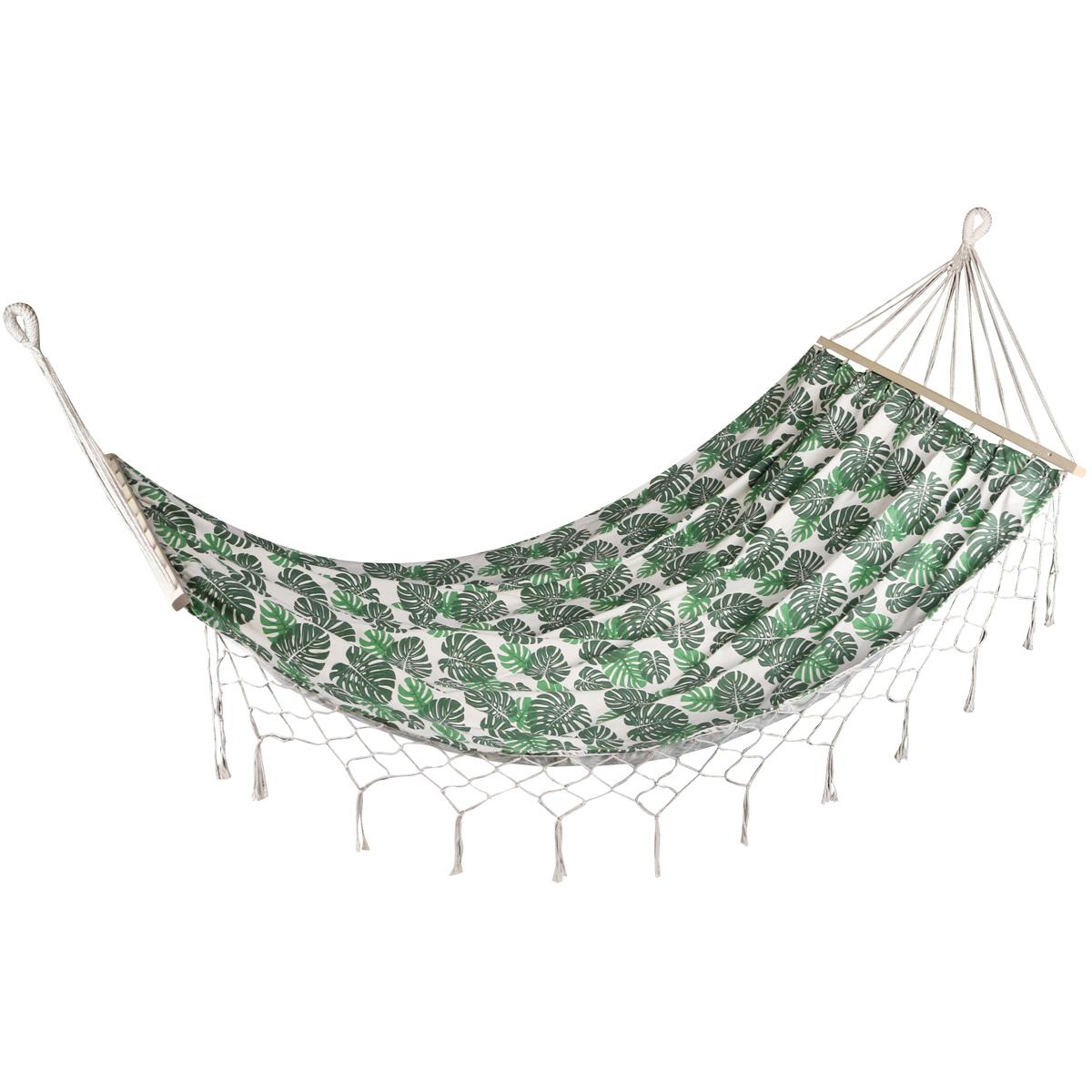 Nasz HAMAK OGRODOWY 1 OSOBOWY 200X100CM Z DRĄŻKIEM I Z FRĘDZLAMI MIAMI NATURA JUNGLE to doskonały wybór na leniwe, letnie popołudnie w ogrodzie. Wysokiej jakości materiał i solidna konstrukcja, o nośności aż 120 kg zapewnią Ci bezpieczeństwo oraz niezwykłą wygodę. Jest bardzo lekki, dzięki czemu możesz go ze sobą zabrać praktycznie wszędzie. Wykonany z naturalnej bawełny jest bardzo wytrzymały i przewiewny, dzięki czemu będzie z Ci zapewniał słodkie lenistwo przez wiele lat. Wypoczywaj na całego na wygodnym i stabilnym hamaku. Zamień kawałek trawy w oazę ciszy i spokoju, bo tym hamakiem, relaks na świeżym powietrzu to czysta przyjemność! Nie masz go gdzie zawiesić? To żaden problem w naszym sklepie internetowym możesz dokupić równie wytrzymały stelaż do hamaków lub każdego rodzaju uchwyty do jego montażu. Nie zwlekaj, każdemu należy się chwila zapomnienia!