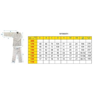 - Rozmiar: 160 cm (wymiary w tabeli – mierzone na kimonie rozłożonym na płasko)