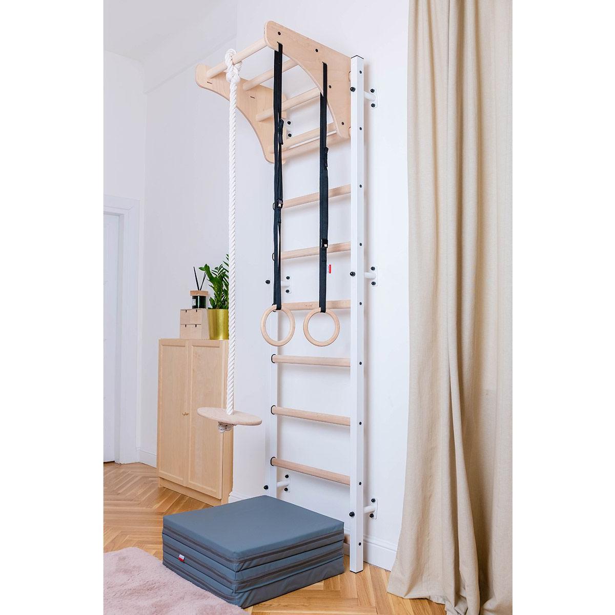 Materac po złożeniu nie zajmuje wiele miejsca. Można umieścić go w górnej części drabinki gimnastycznej.