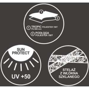 Stelaż z włókna szklanego charakteryzuje się odpornością na uszkodzenia mechaniczne. Pokrycie namiotu uszyte zostało z mocnego poliestru 190T, który chroni przed szkodliwym promieniowaniem UV+50 oraz zapewni wodoodporność na poziomie 800mm słupa wody. Namiot ogrodowy ochroni Cię przed słońcem, deszczem czy wiatrem w umiarkowanych warunkach, należy pamiętać, że nie jest przeznaczony na wystawienie go na ekstremalne warunki pogodowe.
