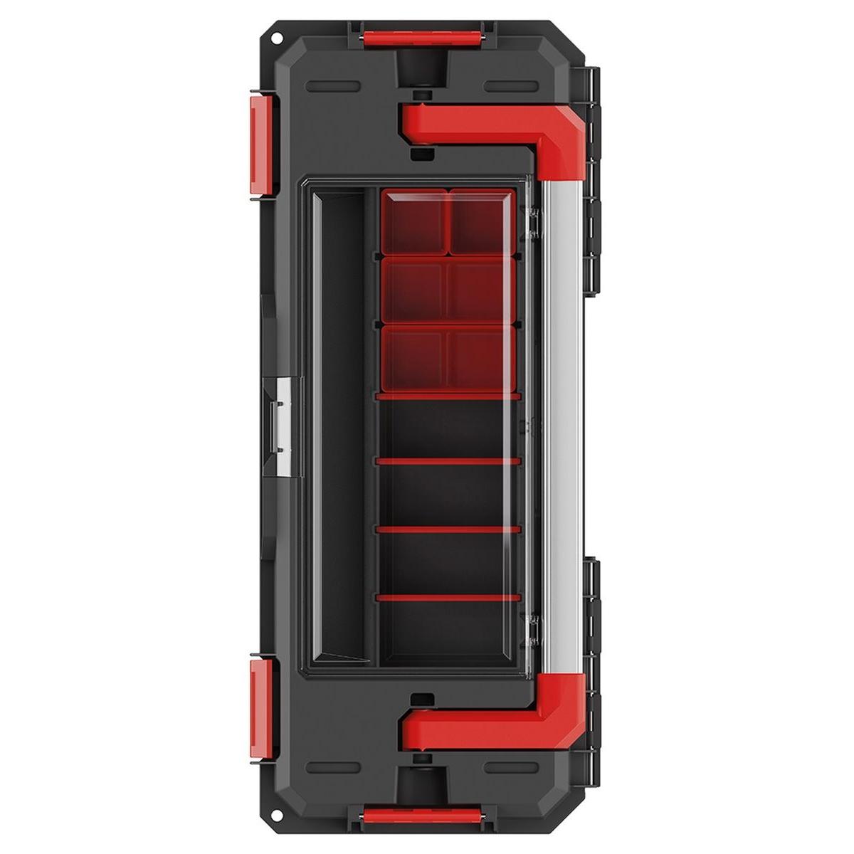 Skrzynka jest bardzo praktyczna, pokrywa zawiera organizer z 6 przegrodami i czterema wyjmowanymi kubeczkami, przykrytymi przezroczystą pokrywą z wytrzymałego poliwęglanu. Wewnątrz znajdują się dwie przegrody, umożliwiające efektywne zorganizowanie przestrzeni.