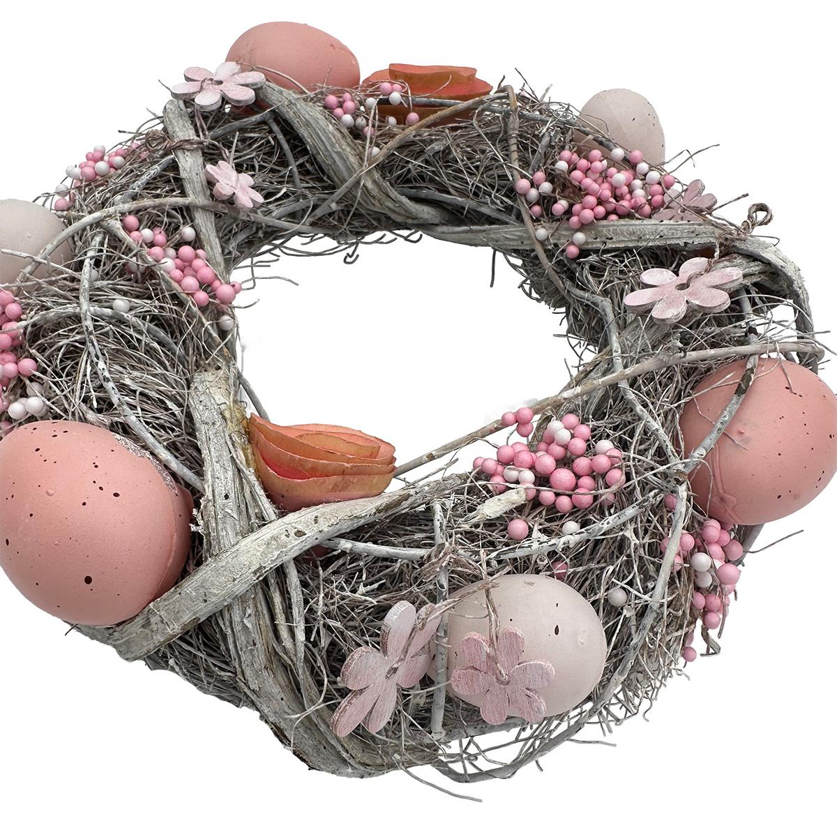 WIANEK STROIK DEKORACYJNY BIAŁO-RÓŻOWY ŚREDNICA 24CM to urocza wielkanocna dekoracja. Pastelowe kolory wianka, białe i różowe drewniane kwiatki oraz nakrapiane jajka i zielone i różowe dodatki, tworzą kompozycję o niepowtarzalnym charakterze.