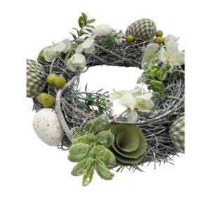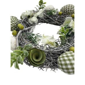 WIANEK STROIK DEKORACYJNY BIAŁO-ZIELONY JAJKA W KRATKĘ ŚREDNICA 24CM to urocza wielkanocna dekoracja. Żywe i kontrastowe kolory wianka, białe i zielone drewniane kwiatki oraz urocze jajka w kratkę i liczne zielone dodatki, tworzą kompozycję o niepowtarzalnym charakterze.