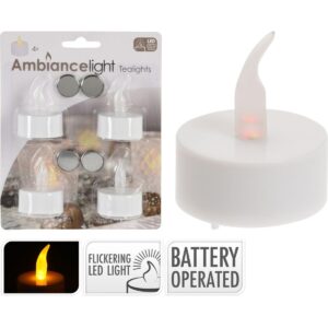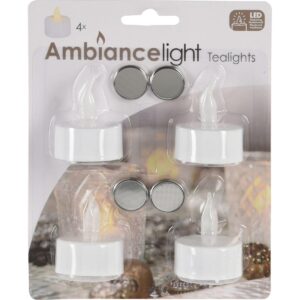 Stwórz niepowtarzalny klimat w swoim domu z zestawem 4 świeczek TEA LIGHT LED! Te lampki z tworzywa sztucznego będą świecić przez długi czas i kiedy tylko zechcesz! Zasilane przez 4 baterie CR2032 dołączone do zestawu, są bezpieczne dla dzieci i zwierząt. Nie wydzielają żadnych szkodliwych substancji ponieważ nie zachodzi proces spalania. Lampka LED imituje żółty, migający płomień co daje bardzo przyjemny efekt.
