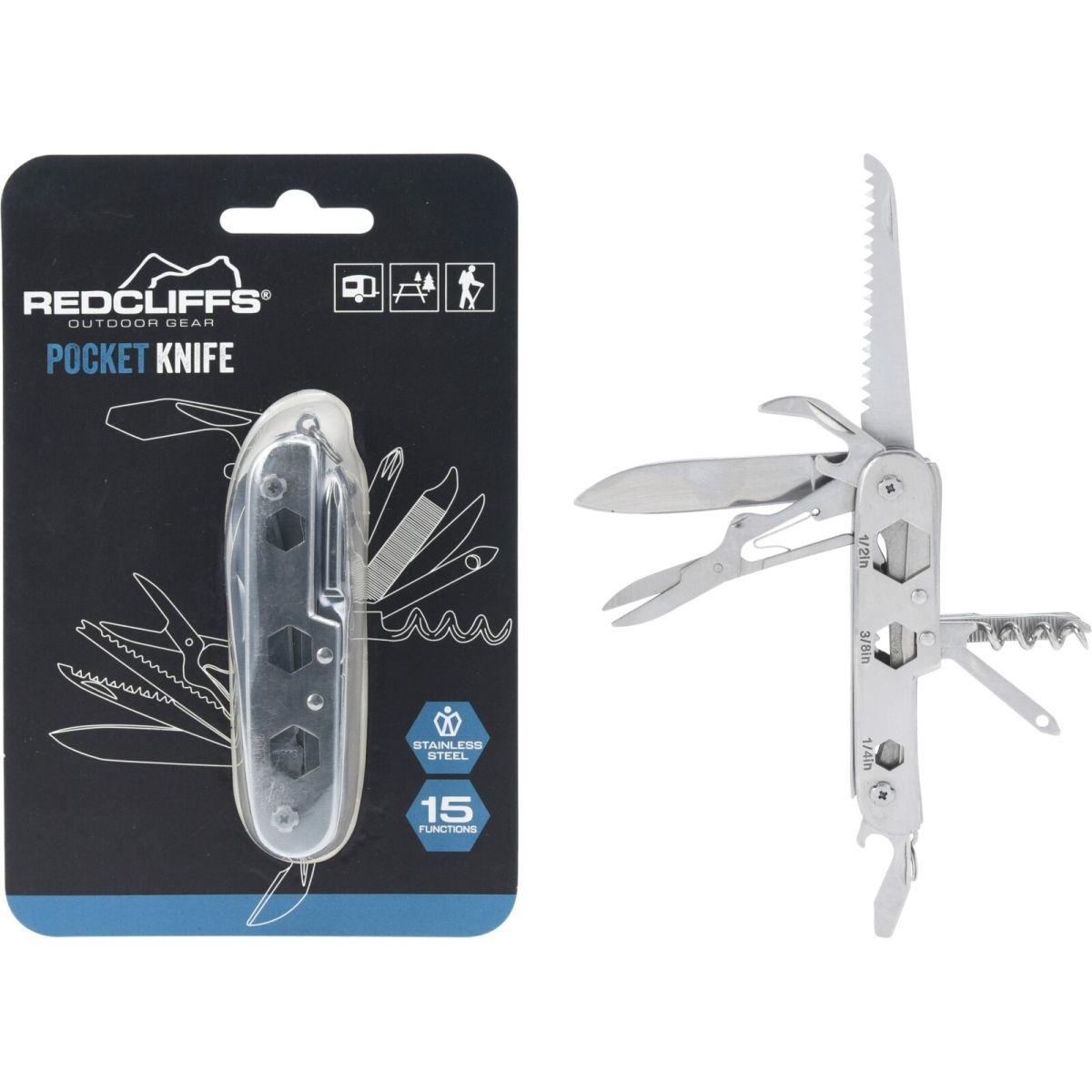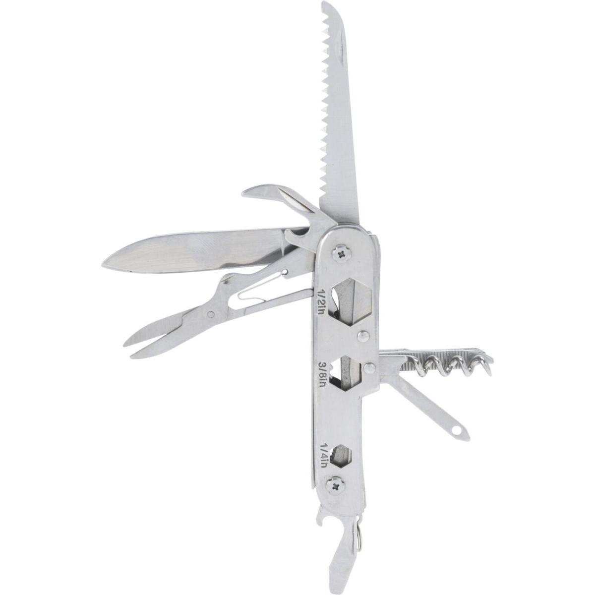 - scyzoryk posiada 15 różnych narzędzi w tym klucz 8,9,10 mm