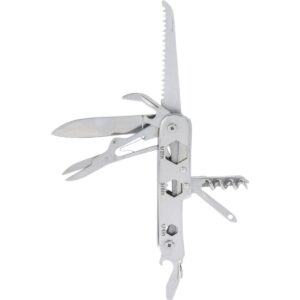 Scyzoryk przyda się np.: do cięcia i oskrobania złowionej ryby, nacinania, przecinania wielu rzeczy oraz materiałów, korkociąg posłuży do otwierania wina lub sprawdzi się również do rozwiązywania supłów. Otwieracz do puszek pomoże Ci otworzyć puszkę, otwieracz do butelek otworzy butelkę a ich płaskie końcówki posłużą również jako płaski śrubokręt, a śrubokręt krzyżowy – posłuży do odkręcenia śrubek poza tym znajdziesz w nim klucz 8,9,10 mm, pilniczek, igła, nożyczki, małą piłę i parę innych przydatnych narzędzi.